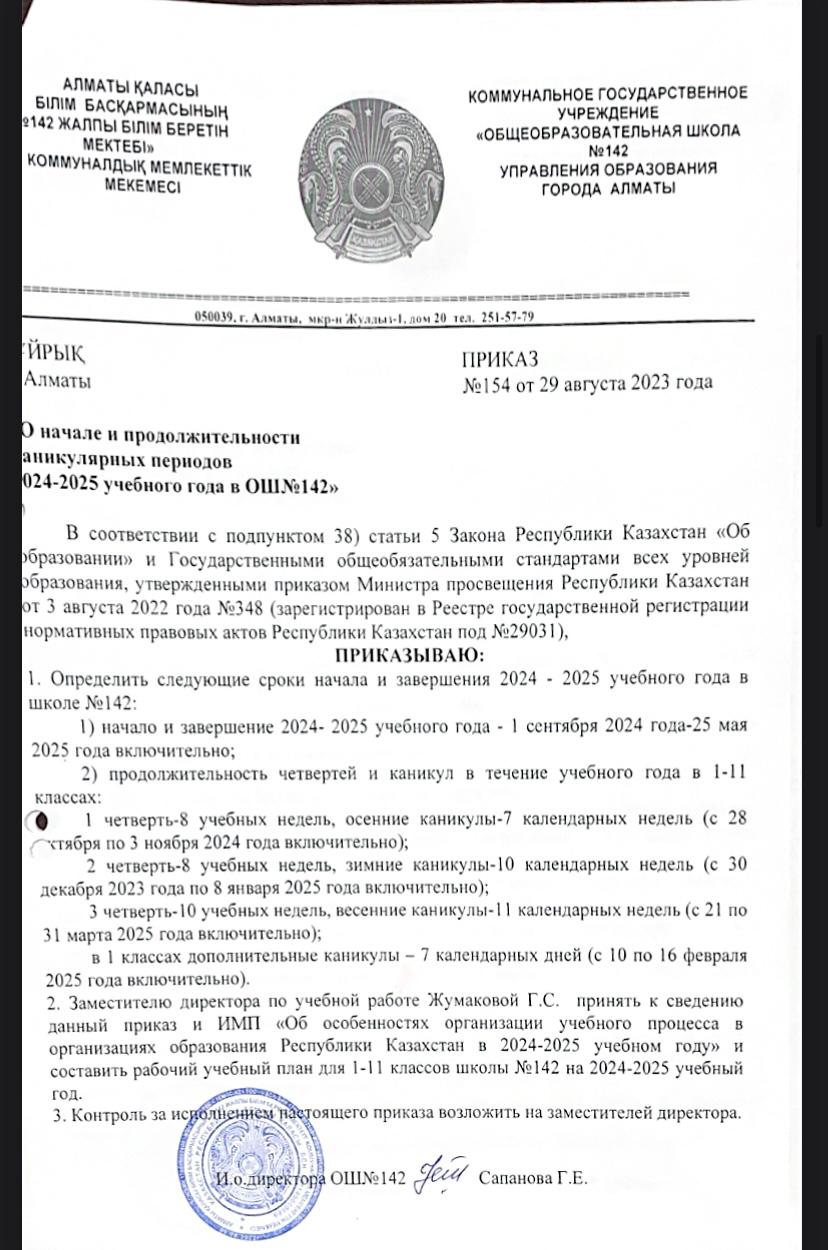 29 тамыз 2024 0 1 2 3 4 5 Приказ о начале и продолжительности каникулярного периода на 2024-2025 учебного года Приказ о начале и продолжительности каникулярного периода 2024-2025 учебного года Осы беттің QR-коды:QR-код этой страницы:
