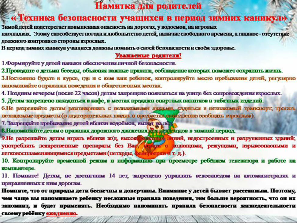 05 қаңтар 2022 0 1 2 3 4 5 Ата-аналар үшін « оқушылардың қысқы демалысындағы техника қауіпсіздігі». Памятка для родителей "Техника безопасности учащихся в период зимних каникул" Осы беттің QR-коды:QR-код этой страницы: