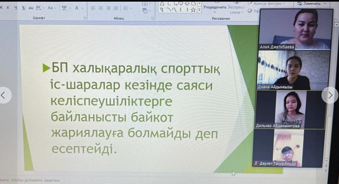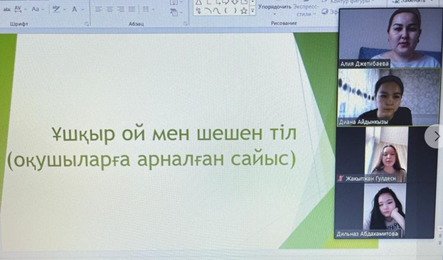 Тарих пәнінің мұғалімі Жетібаева А.С. 5-сынып оқушылары арасында "Ұшқыр ой мен шешен тіл" атты онлайн дебат турнирі ұйымдастырылды. Сынып 2 командаға бөлінеді. Бір команда таңдалған тақырыптың оң жағын көрсетті, екіншісі бұл позицияны жоққа шығарды. Пікірсайыстың мақсаты: оқушыларды өз пікірін айтуға, басқаларды тыңдауға және қарсыласымен сабырлы, достық қарым-қатынаста талқылай білуге үйрету.
