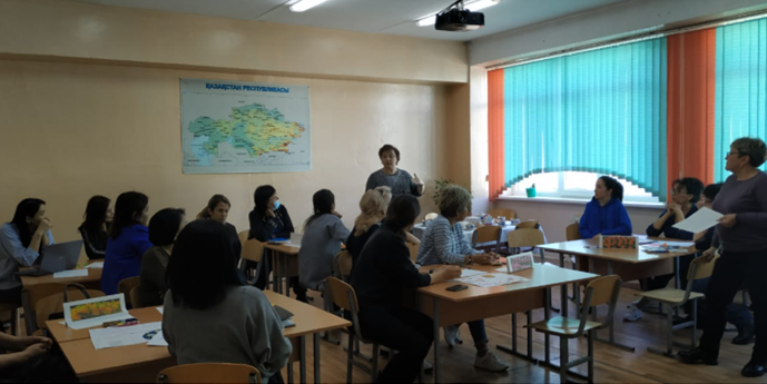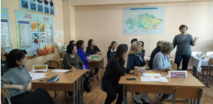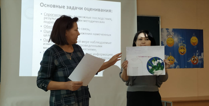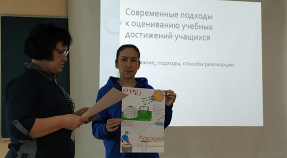 Для обсуждения была предоставлена тема «Наурыз». В процессе тренинга учителям было предложена деловая игра, презентация с различными техниками оценивания. Работа проводилась в группах по составлению критериев оценивания к постерам, составленными учащимися 5 классами. Учителя приняли активное участие в работе тренинга и достигли ожидаемого результата.