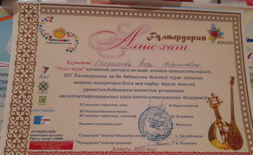 05 сәуір 2022 0 1 2 3 4 5 Республиканский конкурс "Ғұмырдария" "Ғұмырдария" 14 халықаралық балалар байқауының ұйымдастыруымен "Асыл мұра" халықтық дәстүрлі ән және аспапта орындаушылардың ән - балалар мен жасөспірімдер мен жастар өнер байқауының "Ансамболь" жанры бойынша 2 - дәрежелі лауреат. Осы беттің QR-коды:QR-код этой страницы: