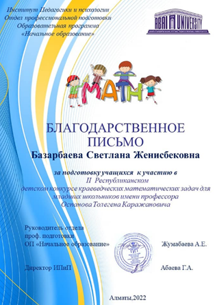 2 «Д» сынып оқушысы Сағымжан Санжар II Республикалық математикалық есептер балалар сайысында «Туған өлкенің сәулет өнері» номинациясы бойынша 1 орынға ие болды.