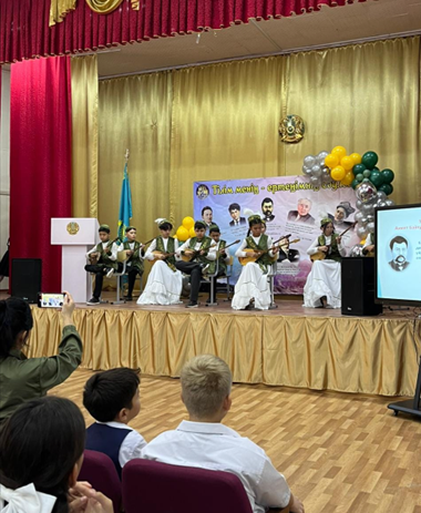 “Әнге әуес, күйге құмар бала- жаны сұлу, өмірге ғашық болып келеді” деп Мұхтар Әуезов айтқандай, осы мерекелік кешіміздің алғашқы шымылдығы музыка пәні мұғалімі А.К.Оразалиеваның ұйымдастыруымен «Балбырауын» ансамблінің орындауындағы “Ерке сылқым” күйімен ашылды. “Тіл жеткізбесті ән жеткізері де бар” дегендей, «Өз елім» әнін айтып өнер көрсеткен 4 “В”сынып оқушысы Сәлімбай Зере мен анасы Тлеубайқызы Тамара көрермендердің ықыласына бөленді. Репрессия құрбаны болған А. Байтұрсынұлының тағдырынан сахналық көрініс көрсетілді. Оған мектебіміздің қазақ тілі мен әдебиеті пәні мұғалімдері қатысып актерлік шеберліктерімен бар көрерменді тамсандырды.Ақынның ролін сомдаған Болысбаев Абай Асхатұлы, ал анасының ролін сомдаған Кабышова Нуркамал Уалихановна. Баласын сағынған анаға Ахмет атасынан хат келгеніне қуанып сүйінші хабарды жеткізіп, қуанышы қойнына сыймай жүгірген 4 в сынып оқушысы Сәлімбай Зере де көрерменнің ыстық ықыласына бөленді. Оқушыларымыз ұлы тұлғалардың тіл туралы және Ахмет Байтұрсынұлының өлеңдерін мәнерлеп оқыды. Олар