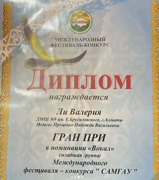 Ученица 0 "В" класса Ли Валерия в номинации "Вокал" в Международном конкурсе "Самғау" завоевала Гран-При .