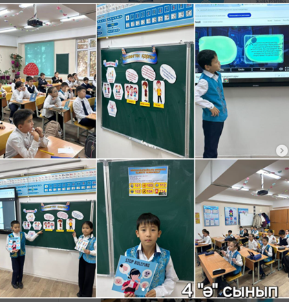 Бүгін 1 сабақта "Өзіңді буллингтен қорға" тақырыбында сынып сағаттары, жеке қауіпсіздік сабақтары өткізілді. Сегодня 1 уроком прошли классные часы по теме "Защити себя от буллинга"уроки личной безопасности.