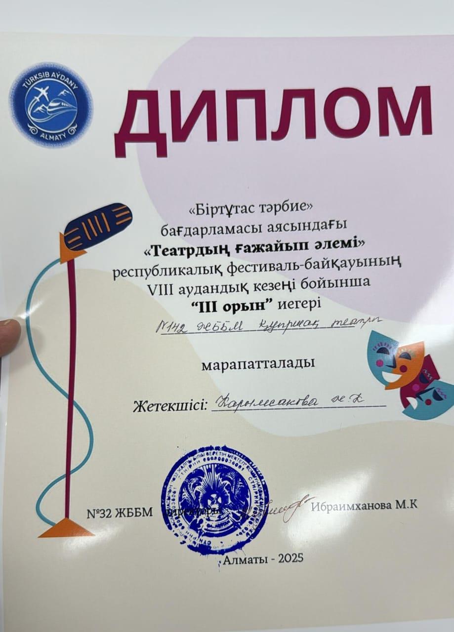 Мұндай игі жоба жас буынды өнерге баулып, киелі сахна өнерінің қыр-сырын меңгеруге мүмкіндік береді."Біртұтас тәрбие" бағдарламасы аясындағы "Театрдың ғажайып әлемі" республикалық фестиваль-байқауының VIII аудандық кезеңі бойынша Ж.К.Карымсакованың оқушылары "Қуыршақ театры" "Мақта қыз бен мысық" ертегісін бойынша ІІІ орын" иегері болды.