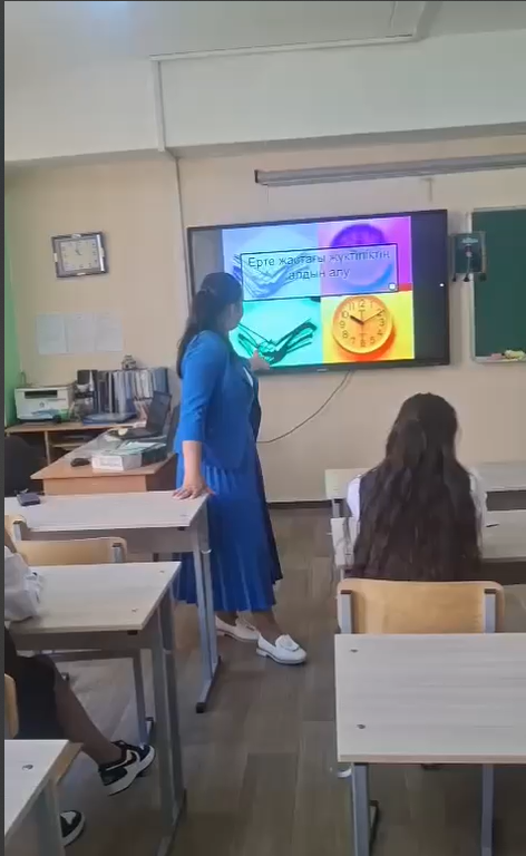12 мамыр 2025 жылы №142 жалпы білім беретін мектепте 9-сынып оқушыларымен «Ерте жүктіліктің алдын алу» тақырыбында дәріс сабағы өткізілді.