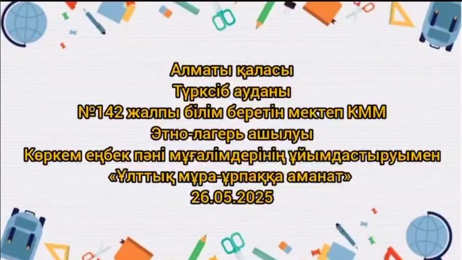 2025 жылдың 28 мамыр айында №142 жалпы білім беретін мектепте көркем еңбек пәні мұғалімдерінің ұйымдастыруымен «Ұлттық мұра – ұрпаққа аманат» атты этнолагерьдің салтанатты ашылуы өтті.