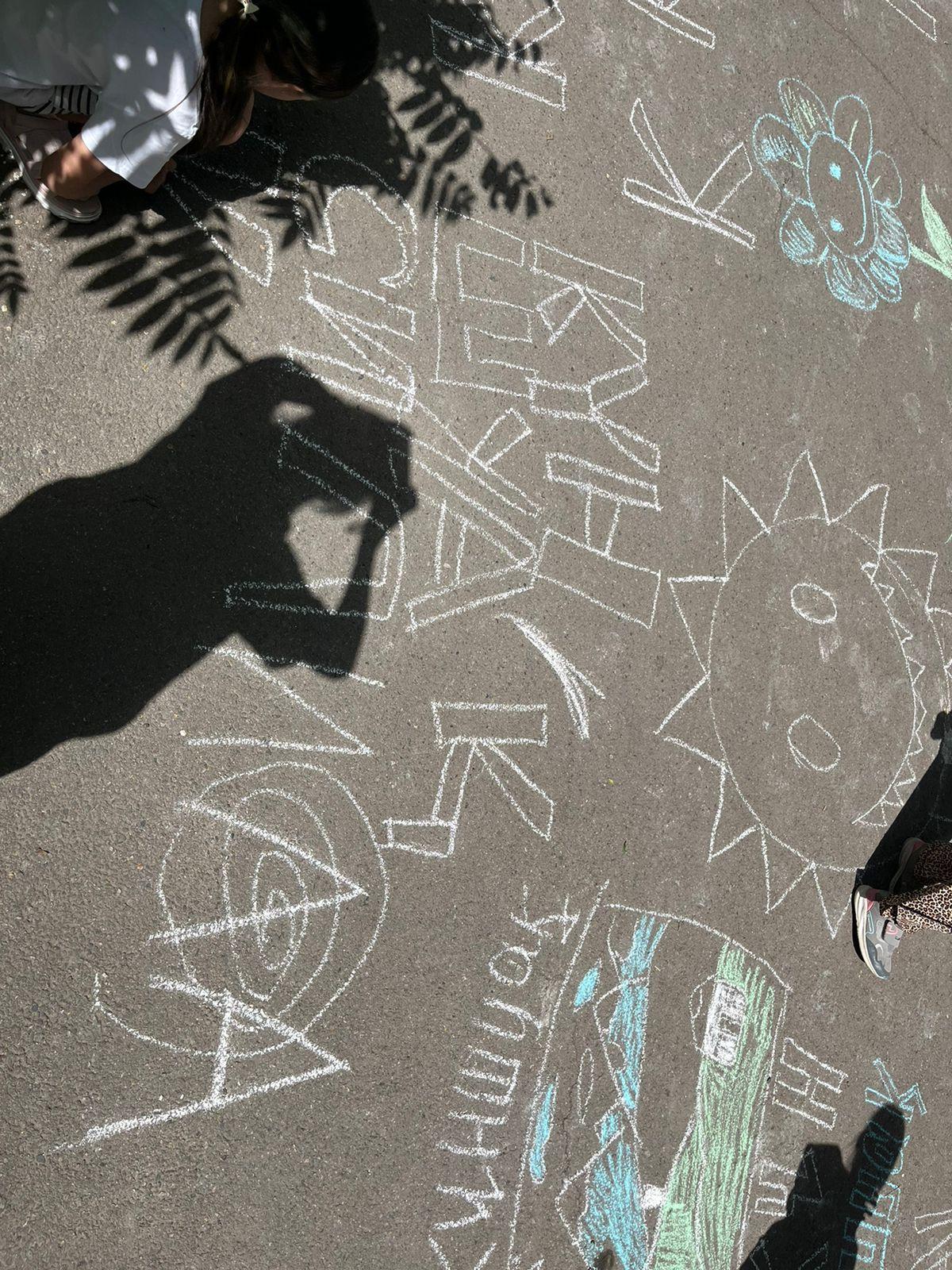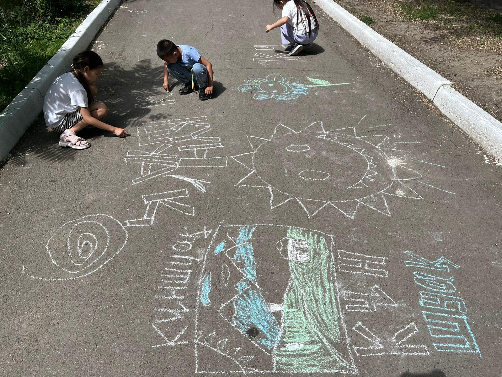 Түскі астан кейін, ашық аспан астында «Бояулы армандар» тақырыбында сурет салу ұйымдастырылды. Балалар өз армандарын асфальт бетіне түрлі-түсті бормен бейнеледі.