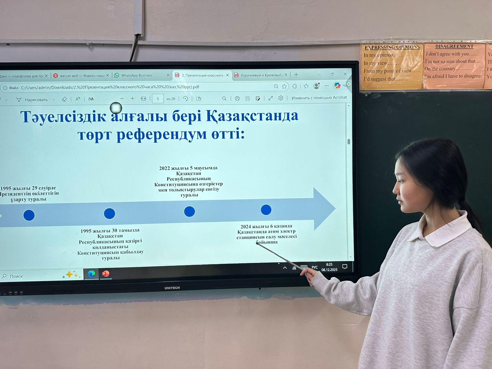 2025 жылғы 8 желтоқсан күні мектепте "Адал азамат" тақырыбында сынып сағаты өткізілді. Іс-шараның мақсаты – оқушыларды адалдыққа, әділдікке, адамгершілікке тәрбиелеу. Сабақ барысында өмірлік мысалдар келтіріліп, адал болудың маңызы туралы пікір алмасу ұйымдастырылды.