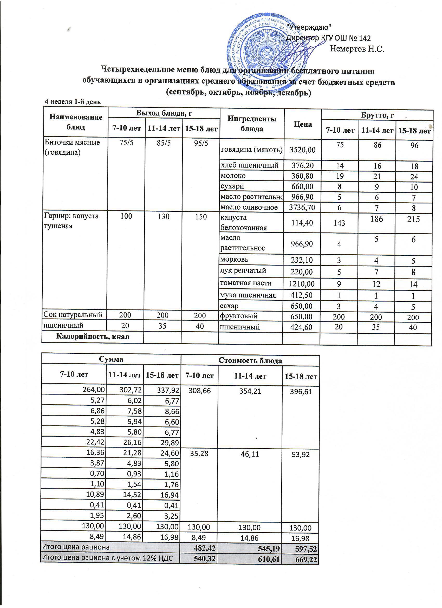 Меню на понедельник. 4 неделя